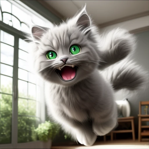gray fluffy cat with green eyes jumping happy disney pixar style