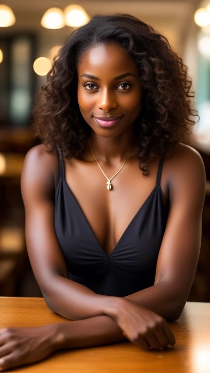 A very dark skinned woman with a lovely smile seated at a cafe table, ((photo-realistic)), ((uhd)), ((down blouse cleavage view)), ((action poses)), (((zoomed in : 1.20))), ((highest resolution)), ((highest quality)), ((highest detail)), ((sharp focus)), (Perfect Face - [ Eyebrow, Eye, Eyelid, Nose, Mouth, Lip, Teeth, Scalp, Throat, Hair ] )), ((Perfect Limbs - [ Shoulder, Chest, Arm, Elbow, Forearm, Wrist, Hand, Finger, Fingernail, Thumb ] )), ((Perfect Limbs - [ Leg, Thigh, Knee, Calf, Foot, Ankle, Toe, Toenail, Buttocks, Hip, ] )), ((detailed jewelry)), ((black as really dark chocolate skin tone)),