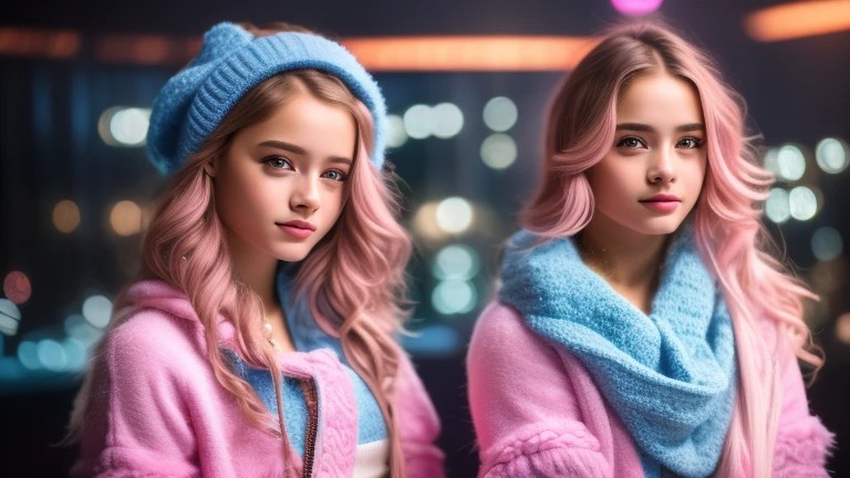 close up portrait of stunninly beautiful twins wearing ((different clothing pink and blue)) in a night club, High resolution, Crisp