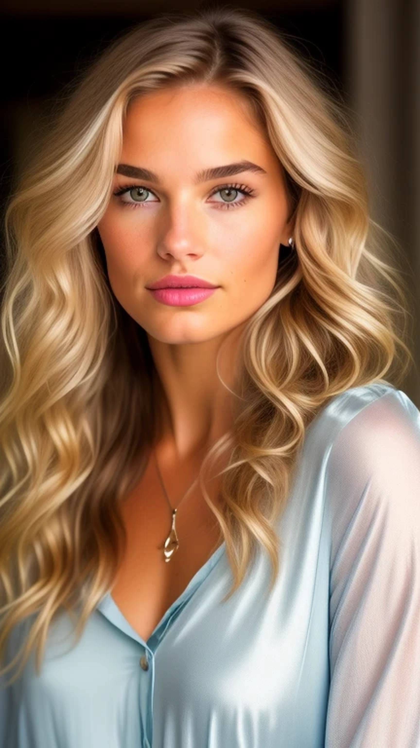 Extremely realistic and highly detailed in-focus image of former CNN anchor (((Natalie Allen))). She is wearing light pink lipstick with a slight metalic sheen, and her eyeshadow is a metallic light blue. Her wavy (dark brown) hair is almost waist-length, extending past the bottom of her breasts. She is wearing an (emerald green silk blouse) with a dark green paisley pattern barely visible, and a wide brown leather belt. Individual hairs on her head should be visible and sharply in-focus, with as much detail as a high-resolution photograph. The CNBC studio should be visible in the background. The picture is detailed enough to see the fine lines on her forehead, and at the corners of her eyes, as well as the pores in her skin. Each (eyelash is clearly defined), and it possible to see differential thickening of the lashes from the dark mascara she uses. Her eyes are ((brown, with a slight amber hue at the edge of the pupil)). Her cheeks are full, looking like a 20-year-old's cheeks, even though the fine lines near her eyes suggest she is in her mid- to late-thirties. She is not wearing any jewelry. The roots of the hairs on her scalp look brunette for the first few millimeters, making it clear that her platinum blonde locks are dyed. She has more pronounced lines under her eyes, with just a tiny bit of puffiness, giving her eyes a look similar to model Allie Ayers, although her nose and the shape of her lips are more similar to model Juli Mery. She has a slight, bemused smile, revealing that her two front teeth have a bit of an overbite.