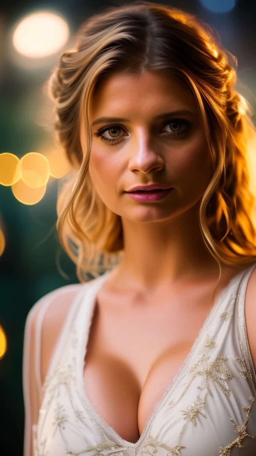 (((Photorealistic))),(showing full body) (Busty:1.3) ((Mischa Barton)) yellow leather dress (((ultra detailed))) (nighttime), 8k uhd