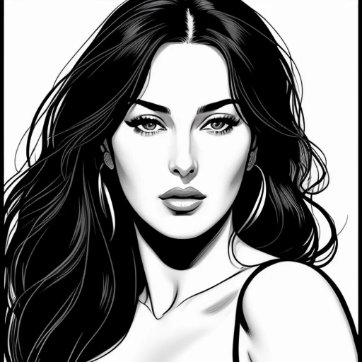 Monica Bellucci, erotic portrait, black and white brush, minimalist, comic