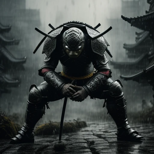 A broken humanoid ninja turtle in battle, samurai armor, dark fantasy illustration, dark tones, epic battle scene, brutal, gloomy, rainy, Akira Toriyama, oblique angle, by Milo Manara and Russ Mills, unforgettable, detailed illustration, 8k, very intricate