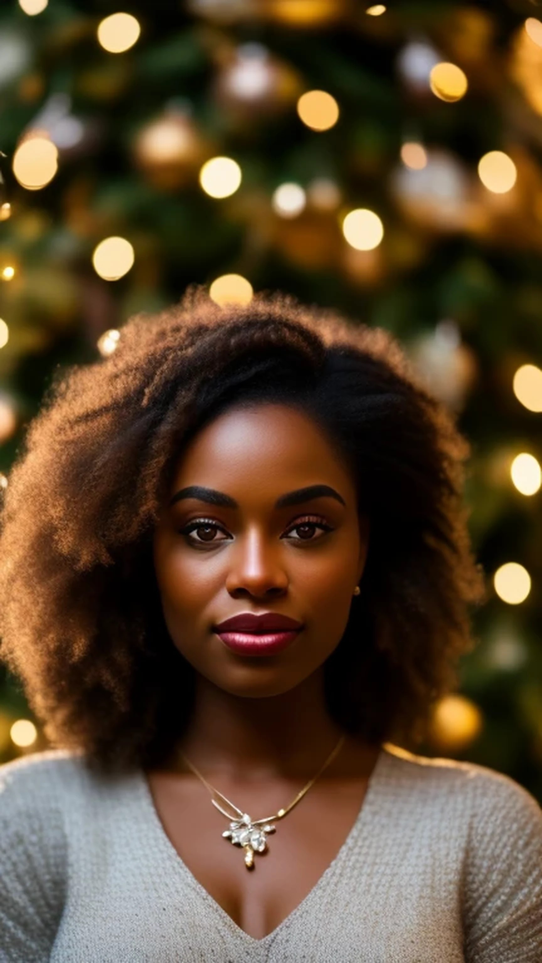 Extremely-detailed and (((in-focus))) photorealistic portrait of a nude young black woman, background - Christmas attributes - Christmas tree - fireplace.