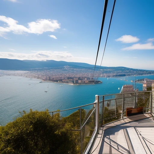 (gondola lift) overlooking the Gulf of Trieste on a windy day, the cabins fly