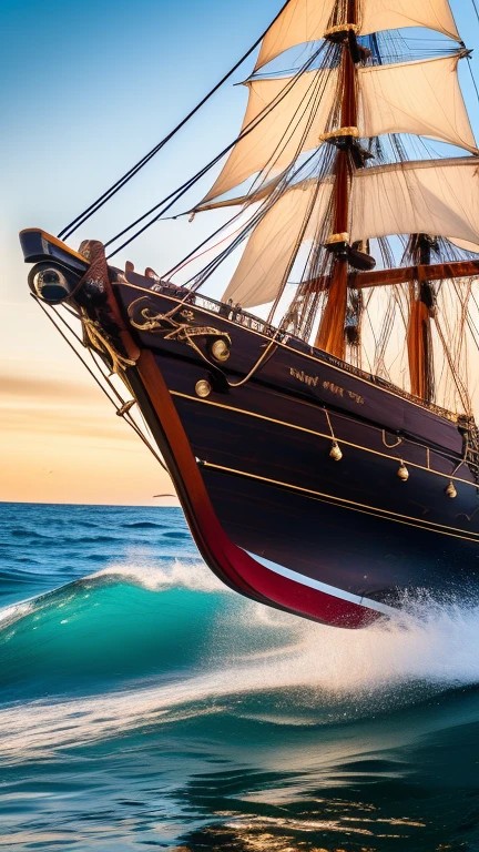 Pirate Ship ((detailed timber)), ((detailed sails)), ((detailed decks)), ((detailed bow)), ((detailed stern)),((detailed ocean)), ((detailed background)), highest resolution, highest quality, 64k, sharp focus, 3d,