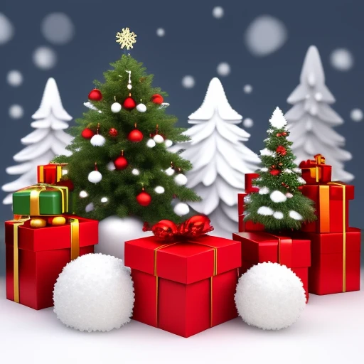 3D rendering of Christmas gift boxes on a snowy background with a red backdrop, C4D modeling, in a cute cartoon style, with a minimalist art style, a simple structure, and a clean, white space in the middle of the picture. Two small trees are placed next to it, with scattered decorations of Christmas tree ornaments and cartoon-style snowflakes flying around. The background is a deep, pure red, creating a festive atmosphere for the New Year's Day.