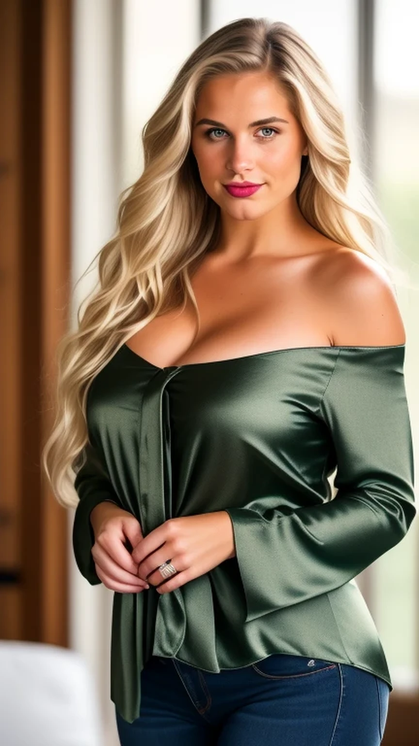 A realistic full-length portrait of ((((Chicago news anchor Marissa Bailey circa 2021,)))) after she had becoming genuinely (((obese))). Her (((((light blonde -- almost platinum -- shoulder-length hair))))) is highly detailed and she is wearing heavy eyeliner, "smokey" eye shadow, and dark red lipstick. The tops of her size (((DDD-cup breasts))) are clearly visible in her (((tight, dark green satin blouse.))) You can see the outline of her nipples. She is rotund, but enjoys being "curvy" and has a pleasant and friendly disposition. She is smiling a wide, toothy smile, accentuating the extra weight that has made her face quite round and with a quite obvious double chin. Her arms are thick and fleshy, and you can see folds of fat through her blouse. Her eyebrows are a medium blonde and thin, since she is a natural blonde. Her eyes are a dark blue, with creases in the outside corners as she smiles. Her hips are quite wide, as befits a woman who is 5'5" but weighs almost 230 lbs -- significantly wider than her shoulders -- and the blue jeans she is wearing look like they are going to burst at the seams. You can definitely see she has a bit of a paunch, with a fold of fat overhanging the top of her jeans. Her fingernails are long, extending approximately half an inch past her fingertips, and are painted a dark red that matches her lipstick. She is striking a pose that could be described as "sexy but casual," and the mischievous gleam in her eyes indicates that she wants you to undress her with your eyes. She is, in a sense, a "tease."