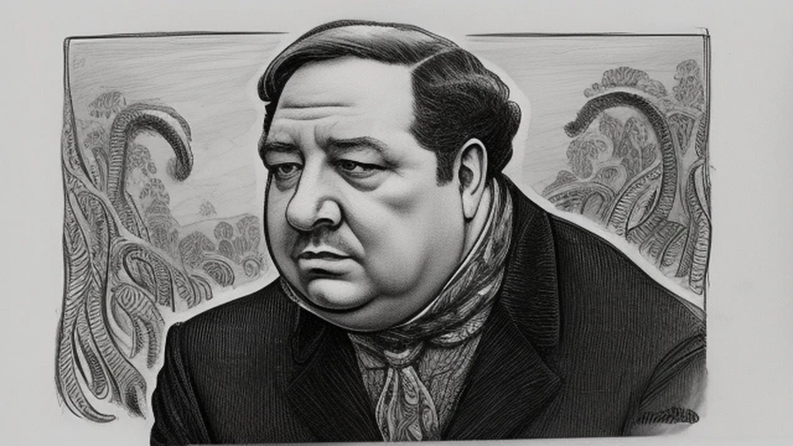 An octopus runs one of its tentacles around the neck of a man who looks like Alfred Hitchcock . Concept art.