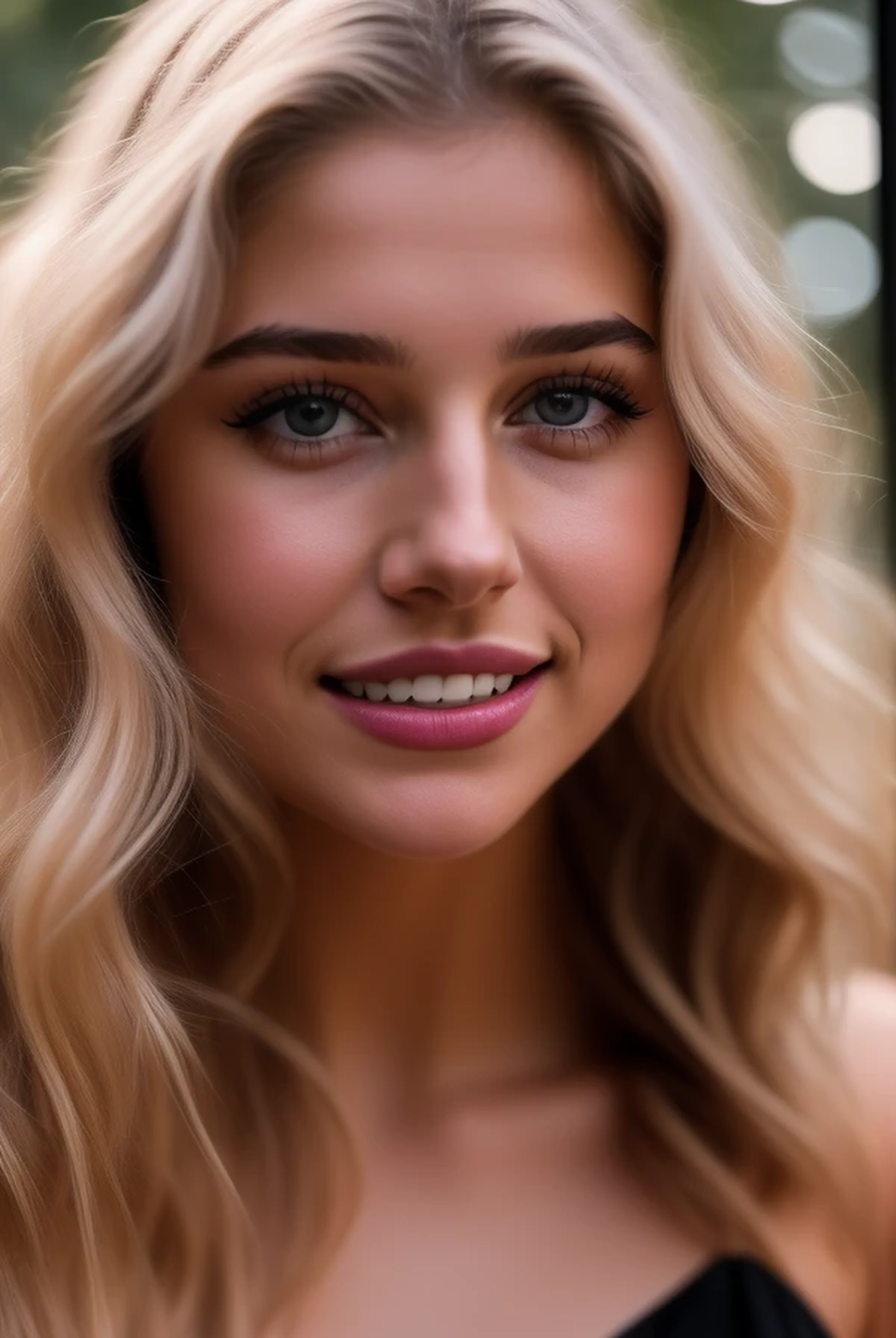 (((8K UHD outdoor portrait with wooded park background))) ((50mm Nikkor f/9 close-up of a young woman with shoulder-length sun-bleached espresso-brown hair)) wearing (((a black satin strapless dress))), and ((smiling broadly with lips done up in glistening dark plum lipstick)), focusing on the ((complex coloration and texture)) of her ((((large, round, and strikingly beautiful pale blue-gray eyes)))), made more prominent by her (((long, curled lashes coated in black mascara))), the (((very wide, dark band of black eyeliner outlining both upper and lower lids on each eye))) and the ((((shiny, glittering dark plum eye shadow coating her eyelids)))). (((Teeth look natural, with a light yellow color, normal-size incisors, regular shape))). She also has (((((an overbite that exposes her top front incisors, which are set slightly in front of the rest of her teeth))))), (((((making them appear larger and more prominent))))). (((The hairline shows the individual hairs))); (((the wavy, radial stroma of the irises can be seen))); ((((pupils are identical in size and perfectly round, dark circles; and reflections in the eyes are physically accurate)))). (((The eyes are based on high-resolution shots of model Elle Trowbridge's eyes, particularly the complexity of the irises))). ((A summer of outdoors has given her a deep, dark tan, but her foundation makeup is matched to the tan, providing her skin with a smooth, flawless, swarthy appearance)). She is in her early to mid-20s. Facially, she resembles a cross between (Melanie Laurent 1.5), (Brittany Murphy 1.9), (Elizabeth Turner 1.8), (Ellana Bryan 1.4) and (Natalia Dyer 1.9), with (the eyes and nose of Olivia Newton-John circa 1975 1.9), and ((((the mouth and teeth of model Noelle Brown 1.8)))). She also has (((visible puffiness under her eyes, a bluish cast to those bags, and deep lines separating that puffiness from her cheeks))), plus ((moderately full lips -- not thin, but definitely not puffy)).