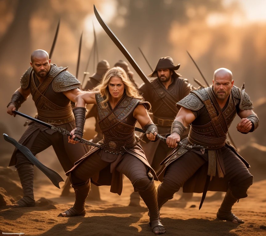 A very angry faced, intimidating looking and aggressive body language pirates with swords drawn at the ready for a fight in 3d ((action poses)), ((photo-realistic)), ((highest resolution and quality)), ((highest detail and sharp focus)), ((perfect face, limbs, digits and attire)),