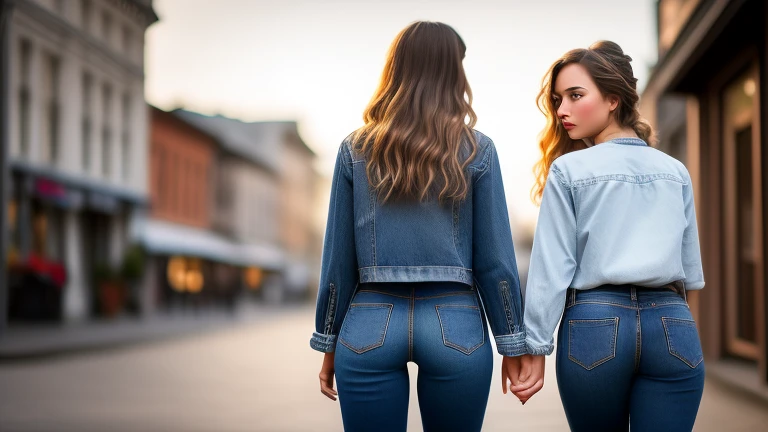 rear view of hipster jeans girl and friend in 3d, ((realistic)), ((detailed background)), ((detailed bodies)), ((detailed faces)), ((highest resolution)), ((highest quality)),