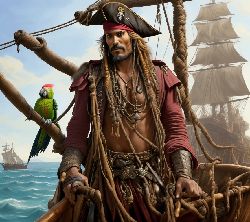 Pirate captain "Long John Silver" with an ((exotic parrot bird)) perched on his shoulder and the ship's ((pirate crew)) in background ((photo-realistic)), ((highest resolution and quality)), ((highest detail and sharp focus)), ((perfect face, limbs, digits and attire)),