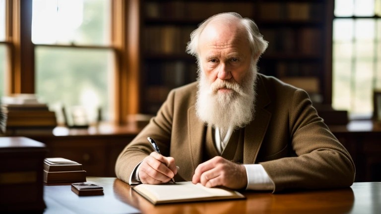 Charles Darwin, writing at his desk, his...