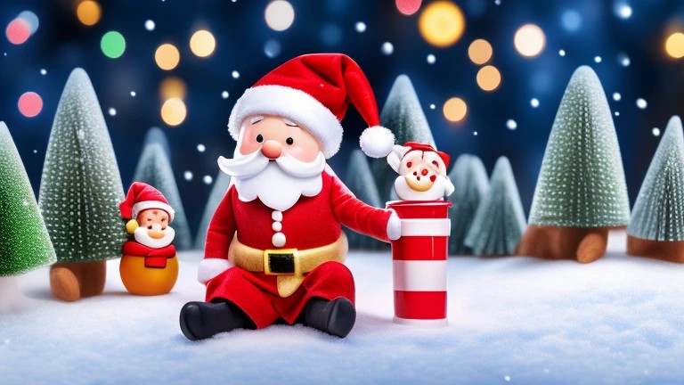 Draw a cartoon Christmas scene background, then draw funny Christmas cartoon of an ant wearing a Santa_hat and holding a sign whilst sitting on the snowy ground in 3d on background, Solo, ((detailed background)), ((detailed bodies)), ((detailed faces)), ((highest resolution)), ((highest quality)),