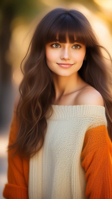 photo art piece featuring a young woman with shiny light brown loose fluffy hair with bangs, slightly smiling. She has green eyes and an orange bird on her shoulder. She wears a soft orange sweater. The background is multicolor vivid blurred with strokes, creating an elegant and fascinating artwork that captures the essence of the young woman with subtlety and charm.
