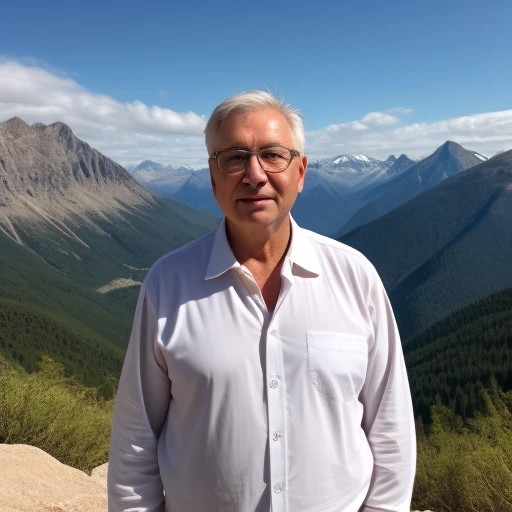 An old man in white clothes and black pants is standing in front of the tall and beautiful mountains and looking at them , واقع گرایی, طبیعت, طبیعی
