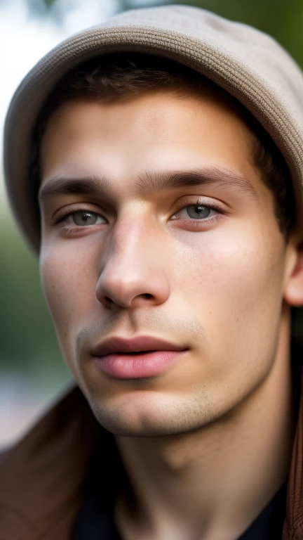 (Ultra high-resolution Associated Press close-up portrait 1.8) of a young ((light-skinned Caucasian)) man in a park. With wrinkles