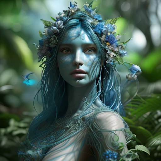 fashion photography portrait of blue human avatar, in blue lush jungle with flowers and birds, 3d render, cgi, symetrical, octane render, 35mm, bokeh, 9:16, (intricate details:1.12), hdr, (intricate details, hyperdetailed:1.15), (natural skin texture, hyperrealism, soft light, sharp:1.2)
