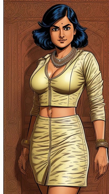 ((Rakhee Thakrar)) (busty:1.4), as a tintin comic ((high-resolution)) in a cordovan colored leather dress, ((8k uhd)), ((Dutch angle))diamond tennis bracelet and diamond earings with a pearl necklace