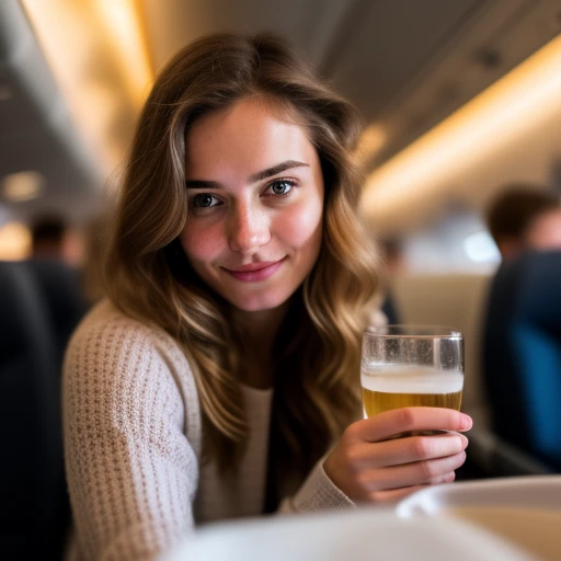 an average looking selfie, Normal average woman, mid 20s, camera glare, beauty mark, very mild acne, selfie taken on a plane, low quality image, she looks tired, head near the top of image, natural expression, holding a glass of champagne, natural low angle, head tilted down towards camera, natural pose, normal person, diffused boring lighting, mundane, boring natural real photo, bad bit depth photo