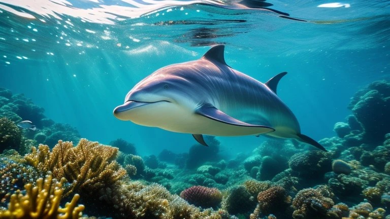 THE UNDERWATER WORLD Bottle Nose Dolphin in 3d, ((choker-shot)), ((photo-realistic)), ((action poses)), ((detailed background)), ((ultra-detailed)), ((perfect face and body)), ((highest resolution)), ((highest quality)), ((8k)), ((uhd))