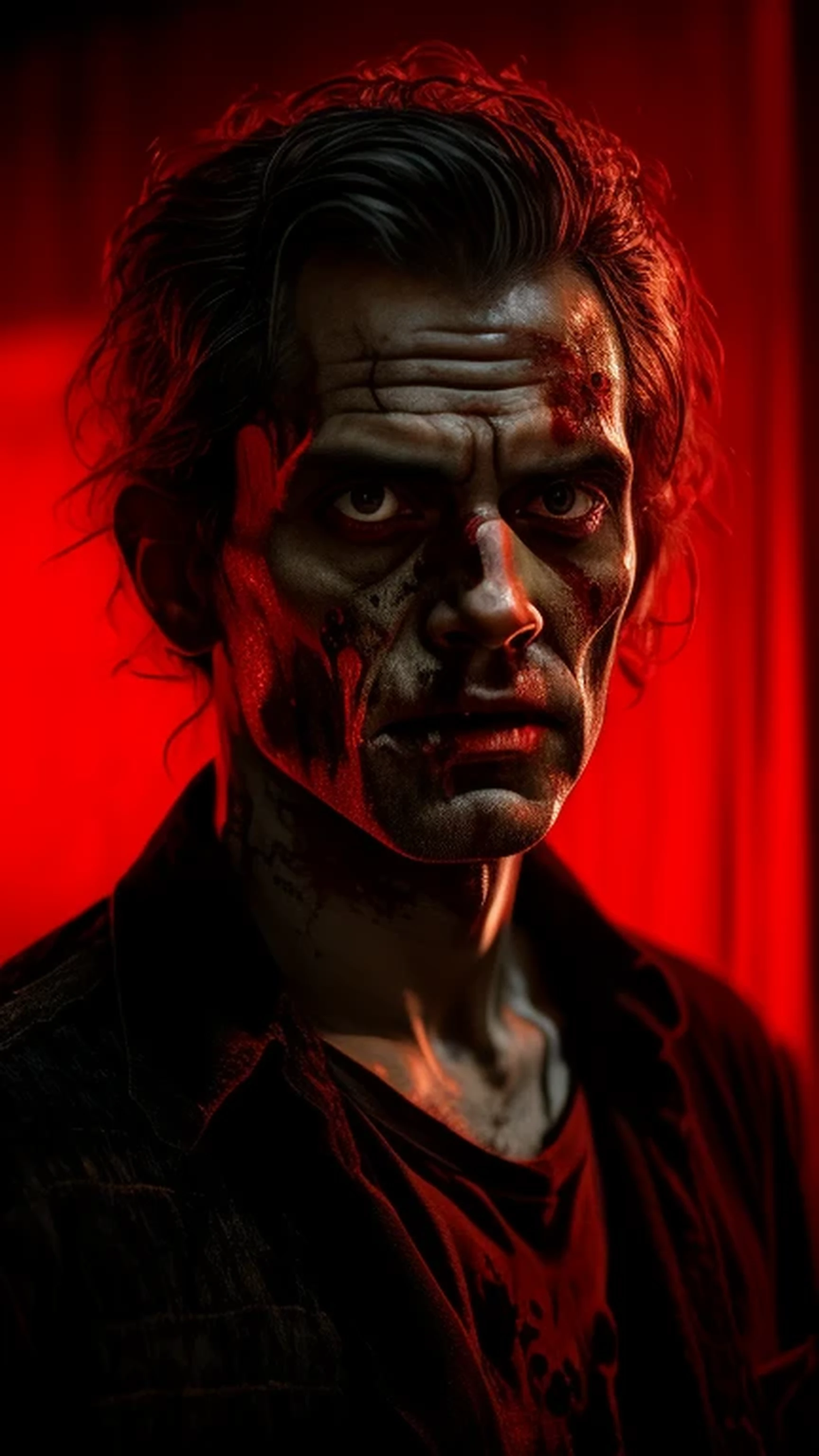 Handsome zombie, Portraiture, Woodcut, Anime, High resolution, Rough, Ruby red, Underlit, Film noir, Norman Rockwell