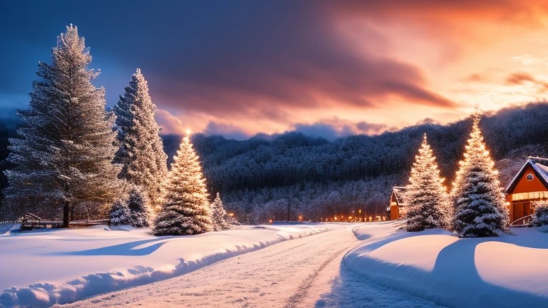 christmas gifts in a snowy landscape,Sunset and aerostatic on the sky