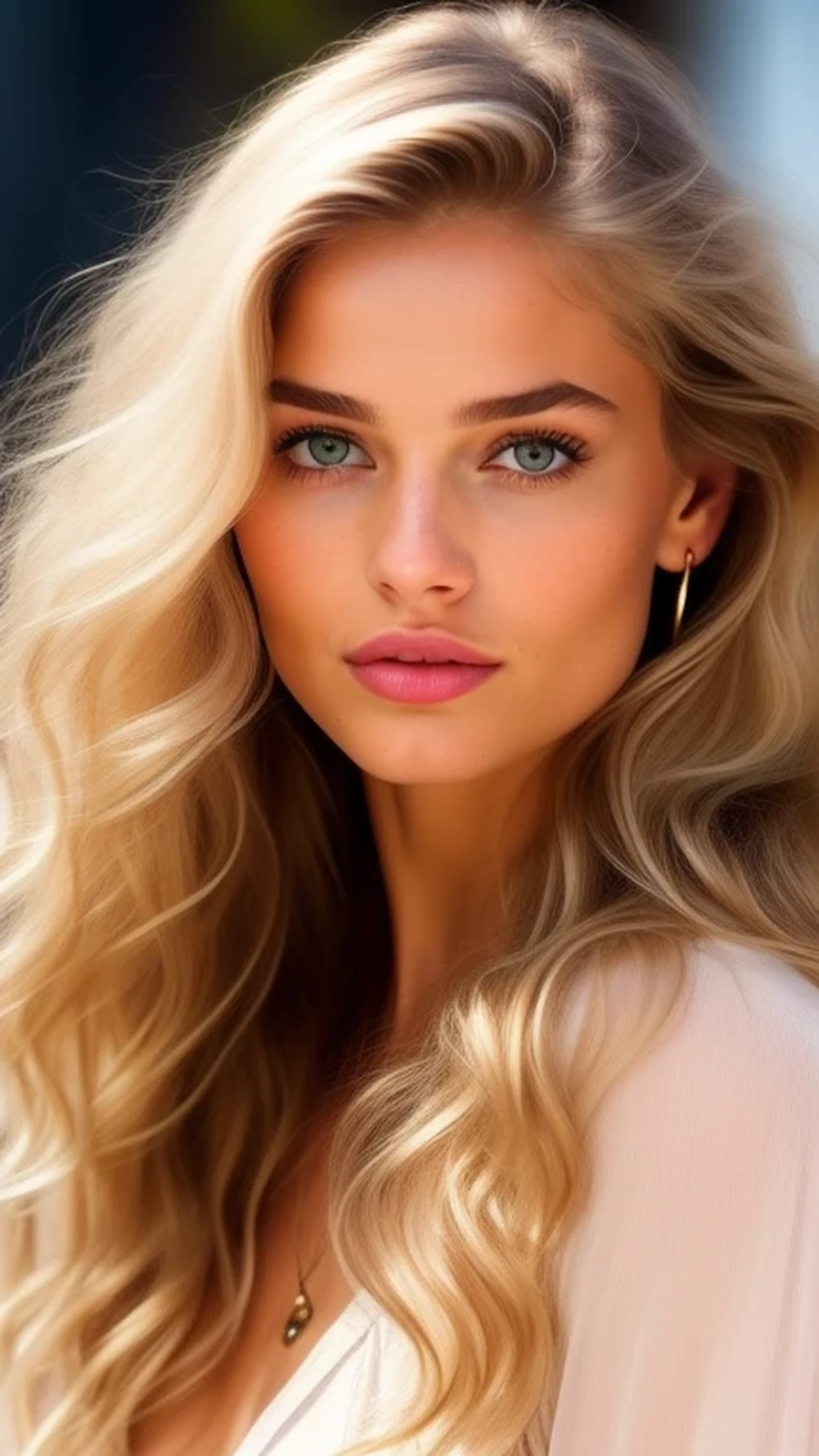 Extremely realistic and highly detailed in-focus image of CNBC anchor (((Sue Herera))) based on (CNBC headshots) from the (early 1990s). She is wearing glossy dark red lipstick with a slight metalic sheen, and her eyeshadow is a metallic light blue. Her (platinum blonde) shoulder-length hair matches the (bouffant style) shown in this video clip of her (https://www.youtube.com/watch?v=hdD2cldVlqE). She is wearing an emerald green silk blouse with a dark green paisley pattern barely visible, and a wide brown leather belt. Individual hairs on her head should be visible and sharply in-focus, with as much detail as a high-resolution photograph. The CNBC studio should be visible in the background. The picture is detailed enough to see the fine lines on her forehead, and at the corners of her eyes, as well as the pores in her skin. Each (eyelash is clearly defined), and it possible to see differential thickening of the lashes from the dark mascara she uses. Her eyes are ((brown, with a slight amber hue at the edge of the pupil)). Her cheeks are full, looking like a 20-year-old's cheeks, even though the fine lines near her eyes suggest she is in her mid- to late-thirties. Her earrings are round, and made of dark hammered brass, resembling small gongs. The roots of the hairs on her scalp look brunette for the first few millimeters, making it clear that her platinum blonde locks are dyed. She has more pronounced lines under her eyes, with just a tiny bit of puffiness, giving her eyes a look similar to model Taylor Hill, although her nose and the shape of her lips are more similar to model Marina Laswick. She has a slight, bemused smile, revealing that her two front teeth have a bit of an overbite.