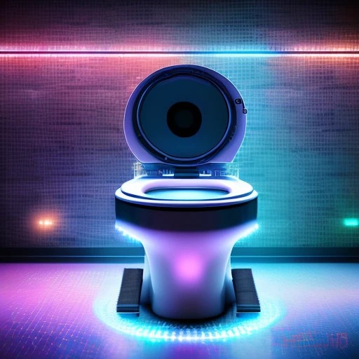 Futuristic Robotic (((Toilet))) under a spotlight, elevated on stage, ((the manufacturor's name emblazoned on the side with text "Midjourney" on the toilet lid in a modern font)), (((excessive detail))), indicators, lights, (((vaporwave))), (((mini LED lights))), foggy haze in the air with strobes and lasers illuminating it, neon lights, HDR, Photo-reallistic, photography, bokeh, best quality