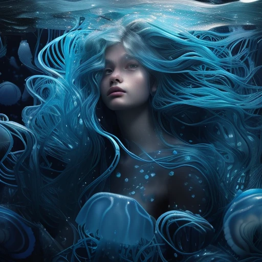 ((blue and navy color tone:1.3)) 1girl, solo,jellyfish filling up the ocean, millions of jellyfish, a girl swimming ((naked)) in the deep ocean surrounded by jellyfish, ((jellyfish)), deep black ocean,under the sea,(photorealistic:1.4), official art, unity 8k wallpaper, ultra detailed, beautiful and aesthetic, masterpiece,best quality, (dynamic angle:1.4), glowing skin, (floating colorful sparkles:1) the most beautiful form of chaos, elegant, a brutalist designed, vivid colours, romanticism, ultra wide angle,