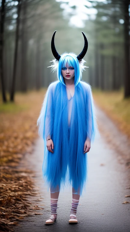 Three-legged humanoid with transparent skin, blue hair eyes on cones, horns