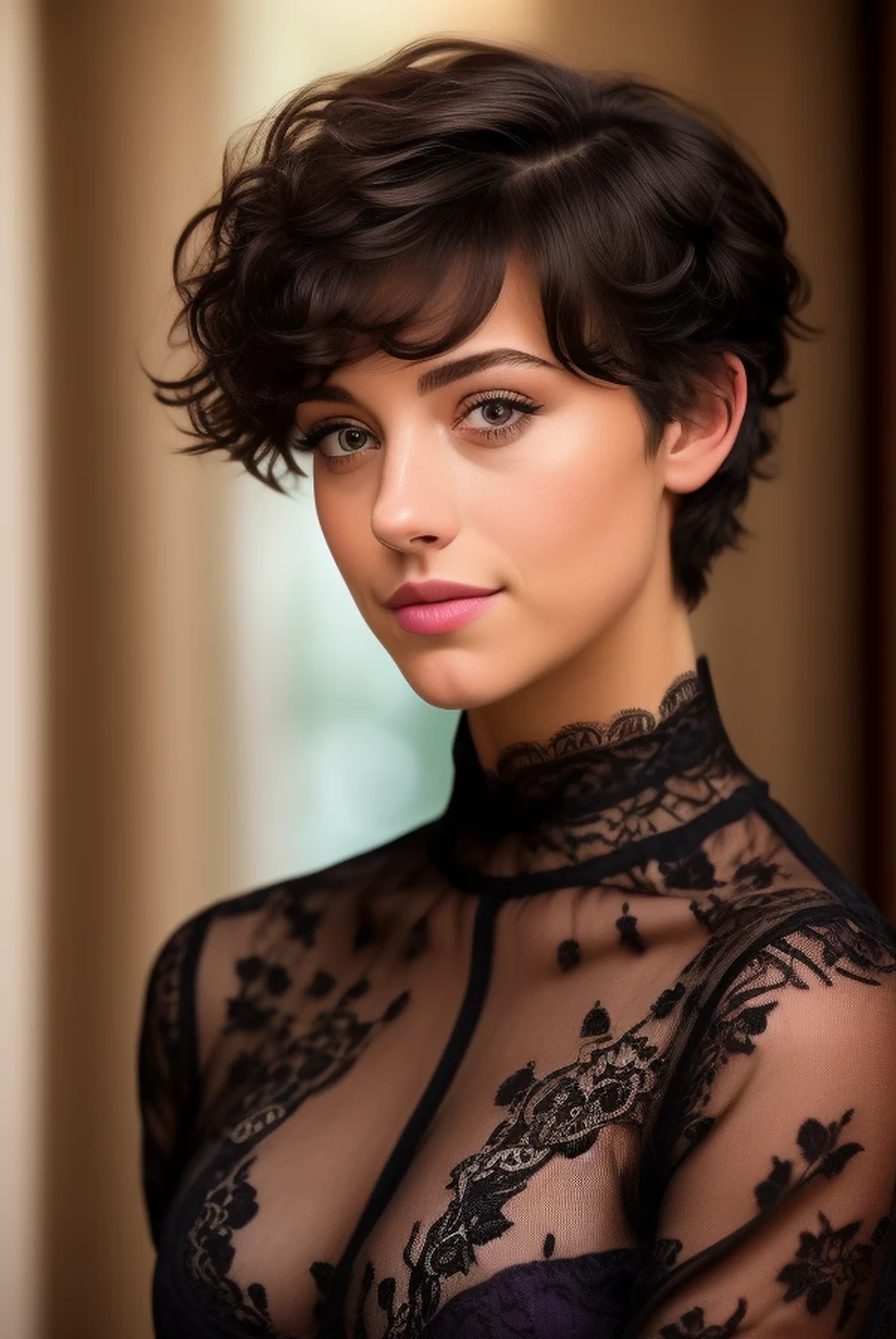 ((High-resolution Associated Press close-up portrait)) of a young (fair-skinned Caucasian) woman in a bar, wearing ((intensely colorful and theatrical lipstick and eye makeup)): ((((glittering plum eye shadow, turning eyelid to eyebrow a rich dark purple)))), and a ((((thick, glistening layer of Trophy Wife Crème frosted pink lipstick))). (((She has fine, short raven black hair -- hair tapered on the sides and back, so her ears are completely uncovered 1.9))), but left ((about six inches long on top for styling: lightly permed, then treated with hair gel and blow-dried straight back from her forehead and face -- in effect, a wavy brunette pixie cut that flows from the hairline back over the top of her head, like a windswept, river of oil following the contours of her skull, until finally dovetailing at the nape of her neck 1.9)). She has (soft, pale blue-gray eyes 1.8)) with (perfect round irises), (round, dark pupils) (long, thick lashes), enhanced with ((thick mascara and a heavy line of black eyeliner outlining her entire eye 1.8)). (Liberal use of concealer and dark bronze blush on the crest of her cheeks gives her skin a smooth, flawless look). The woman is in her early twenties, ((dressed in a sheer black lace blouse 1.9)). (She is tall, slender and athletic). Facially, she's a mix of (Melanie Laurent 1.3), (Brittany Murphy 1.9), (Elizabeth Turner 1.8), (Ellana Bryan 1.4) and (Natalia Dyer 1.9), with (the eyes and nose of Olivia Newton-John 1.9). She has (full, sensual lips, though the upper lip is less full than lower lip). She also has ((puffiness under her eyes and deep lines demarcating the bottom of those bags)), and ((lightly freckled skin, which is barely visible through her makeup 1.9)). ((She has a significant overbite, with the front two teeth of the top row sit slightly forward of the rest and creating a very slight buck-toothed grin 1.3)). (Her lips show fine vertical lines beneath the lipstick).