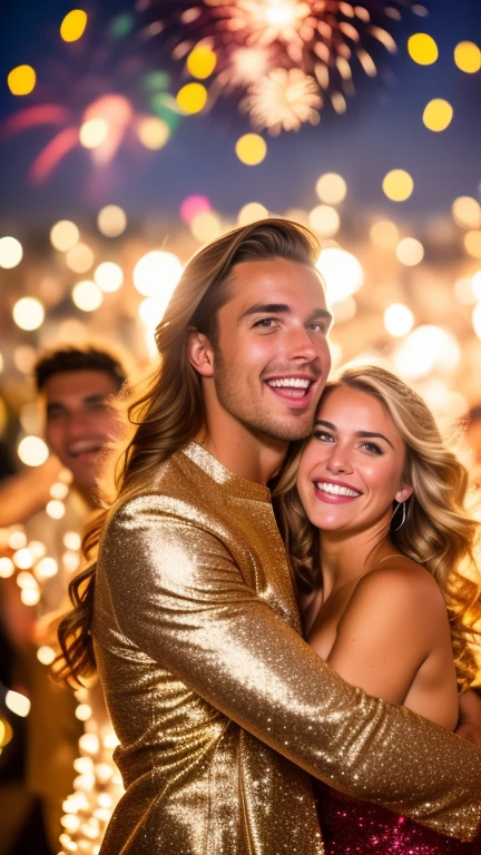 New Years Eve Fireworks Celebration Party Revelers Dancing, Woman With Her Boyfriend in foreground ((high-angle-up-shot)), ((perfect smile)), ((perfect teeth)), ((action poses)),