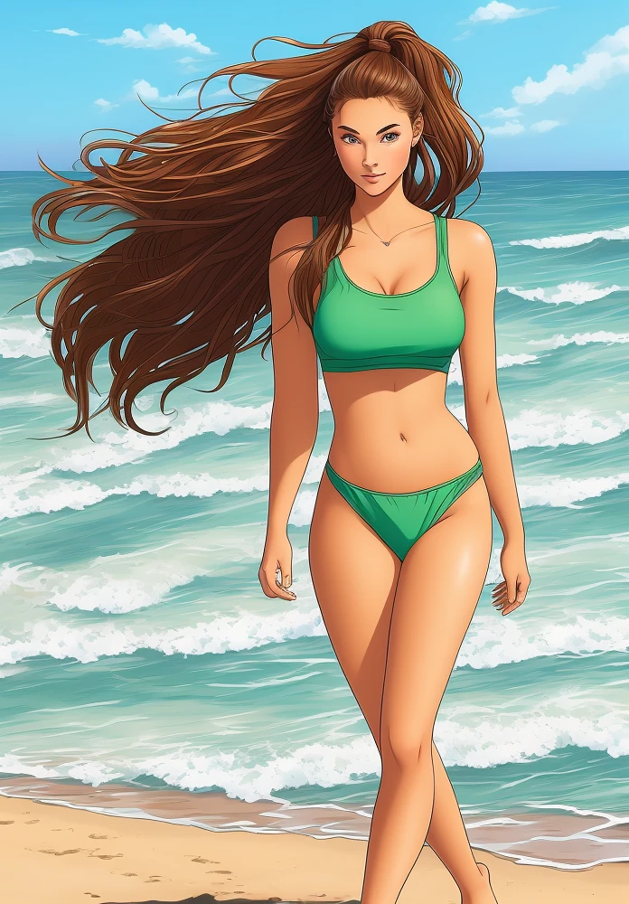 super gorgeous and sensual 18-year-old girl walking at the beach, hot, beauty, yummmmy brunette, ponytail, full body, green eyes, sweating.