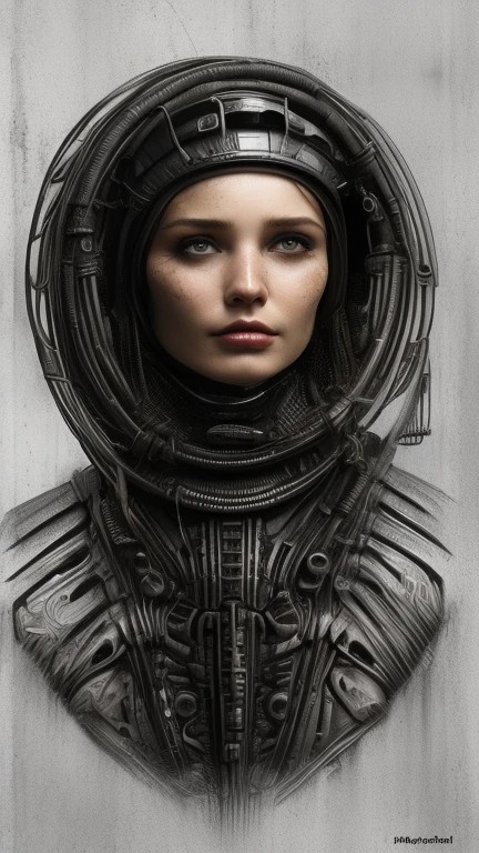 woman wearing helmet in the style of ((Hans Ruedi Giger))