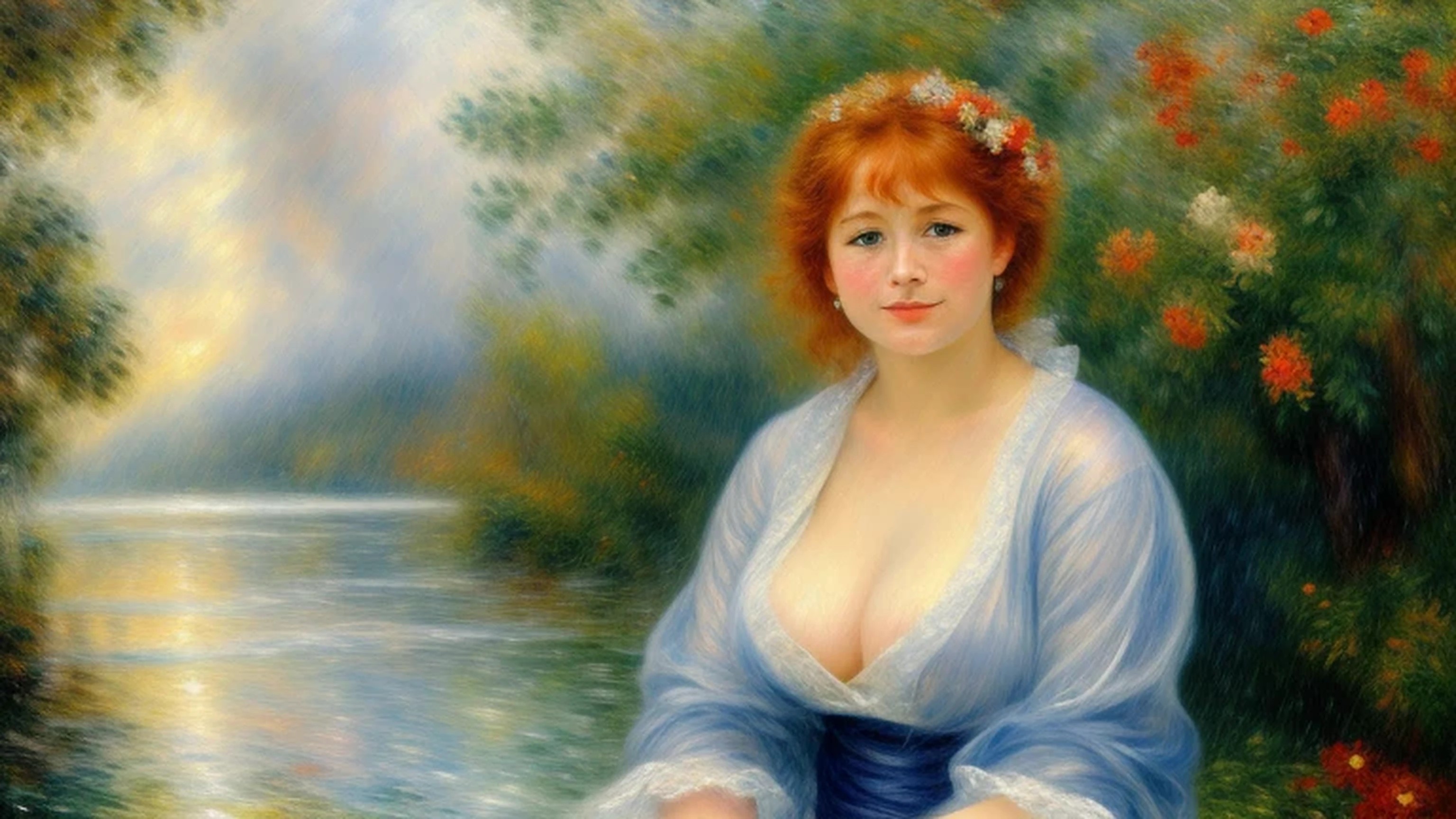 {{{high resolution}}} {{Renoir}} {{oil painting}} (20 years old old woman) (big breast) (running rain Thunder) lake