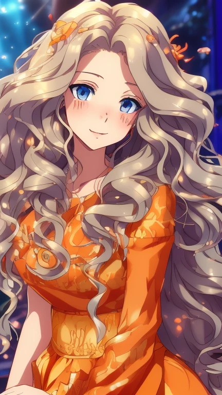 very pretty young ((happy)) woman with blue eyes, wavy hair wearing gold color jewelry going to a wedding, , Tangerine Orange