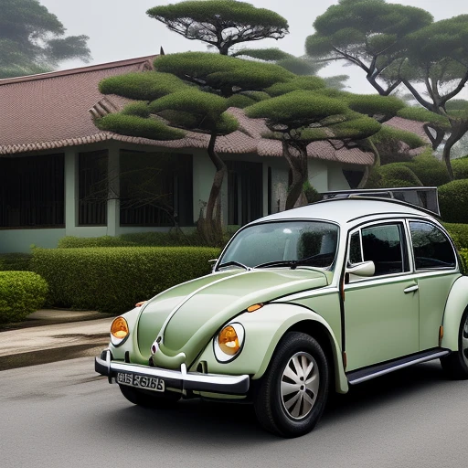 A short south china pine tree in front of a bungalow. A VW beetle parked in the driveway.