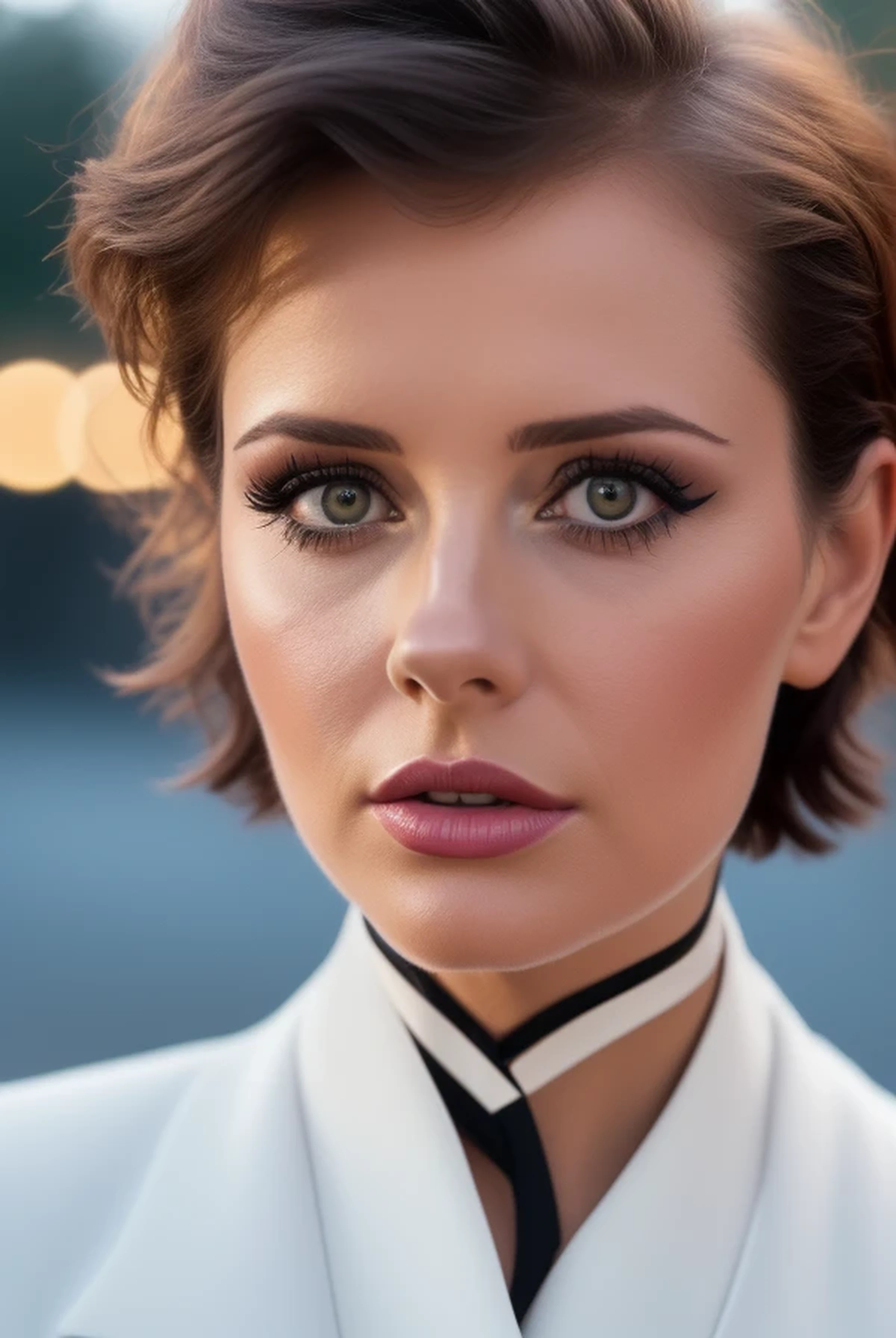 ((8K UHD extremely precise and detailed Elle Magazine portrait, with diffuse sunlight, park backdrop)) of (((an attractive young brunette facing and smiling at the camera))). She is in her early 30s, with ((((dark espresso-brown hair)))) ((((styled in a very short pixie-cut)))) ((((reminiscent of Patrick Nagel's 1980s series of paintings of chic, brunette short-haired women)))) with ((((dramatic angular asymmetrical haircuts, dagger-like pointed sideburns, and angled bangs held in place with plenty of hairspray)))). She is wearing (((a double-breasted azure silk business suit, over a black gauze blouse))), and has on (((professional glamour makeup, with intensely dark eye makeup accentuating her eyes))). She has (average lips done up with glistening crimson lipstick), and a (slight overbite), with ((the front two incisors in the top row sitting slightly forward of the rest, making them appear larger and quite prominent, like the teeth of model Noelle Brown)). ((((Her eyes are unusually large, round, and bright, giving her a literal "wide-eyed look" as she looks directly at the camera)))). Eyes are (((((pale blue, perfectly formed, with perfect round irises; dark, round pupils that have a diameter 40% the diameter of the irises; pupils perfectly centered in the irises))))), plus ((accurate reflections in the eyes)). Their beauty is enhanced with (((heavy use of "smoky-eye" eye shadow))); ((((a thick line of black eyeliner rimming the entire eye and extending 1/4" past the outer edge of her eyelids)))); (((non-clumping mascara on pressed and curled long, lush lashes))). ((((The complex colors and radial striations, or stroma, of her irises are visible, as well as small specks of gray in her irises)). Facially, she's a mix of (((Melanie Laurent))), ((((Lydia Bielen)))), (Zooey Deschanel) and ((((a young Agnetha Fältskog, circa 1976)))), with (((the perfect high-definition eyes of Elle Trowbridge))), (the eyelashes of Marie Osmond), (the nose of Olivia Newton-John).