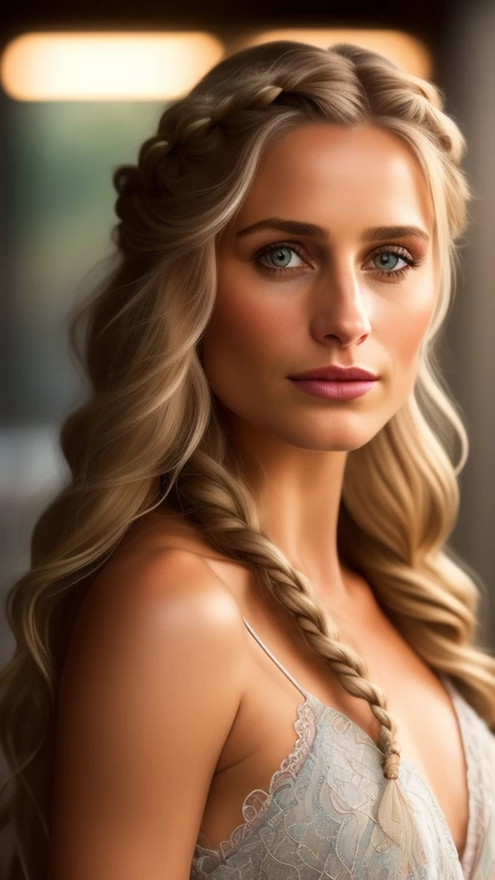 Photorealistic ((high-resolution portrait)) of ((actress Helen Slater)) in a silver evening gown, waiting by herself at a restaurant bar. Slight blue tint under her eyes due to blood vessels near the surface. Pores and texture visible on skin, so it's not perfectly smooth. Little concealer, some lip-gloss. Blue-green eyes. Her blonde hair is waist-length but ((braided and hanging over the front of her right shoulder)). ((Extreme detail)) in this picture makes every hair -- even very fine hairs along her hairline or on her neck -- clear and perceptible. Eyebrows are blonde in color and have natural edges, with some variation in the length and position of the hairs. Eyelashes are long and luxurious, and she wears pale bluish-silver eyeshadow, which enhances the color of her eyes. ((Her evening gown has richly detailed lace edging and a plunging v-neck.))