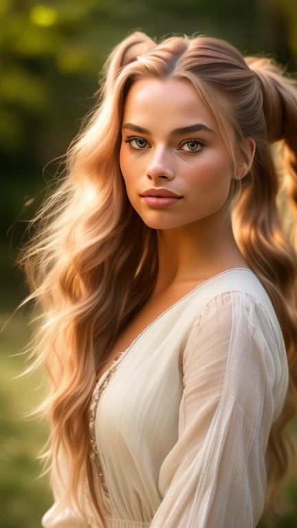 ((chestnut color hair)) in (((two color ponytails))) at the back of her head. Soft and supple ((rounded)) facial features. ((young)) woman like ((Harley queen)) and (Margot Robbie). ((pale skin) (((alluring country outfit))) sexy