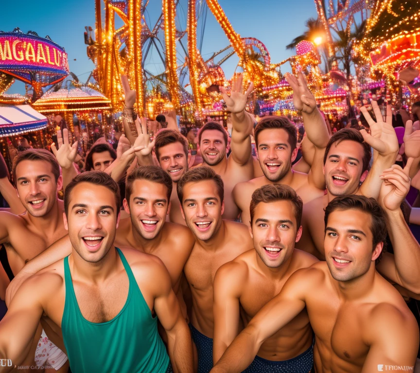 Very happy faced, radiant looking bachelor party of men with fun-loving body language having a day-out at the amusement park in 3d ((action poses)), ((photo-realistic)), ((highest resolution and quality)), ((highest detail and sharp focus)), ((perfect face, limbs, digits and attire)),