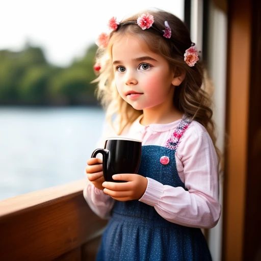 Beatifull little girl child in the morning offering coffee. On the sound the beginning of the day with lots of flowers and hearts