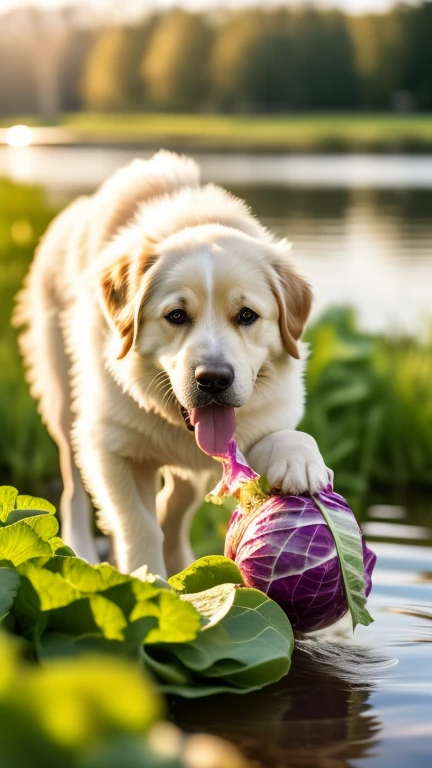Dog eating a cabbage by the lake side. Realistic image