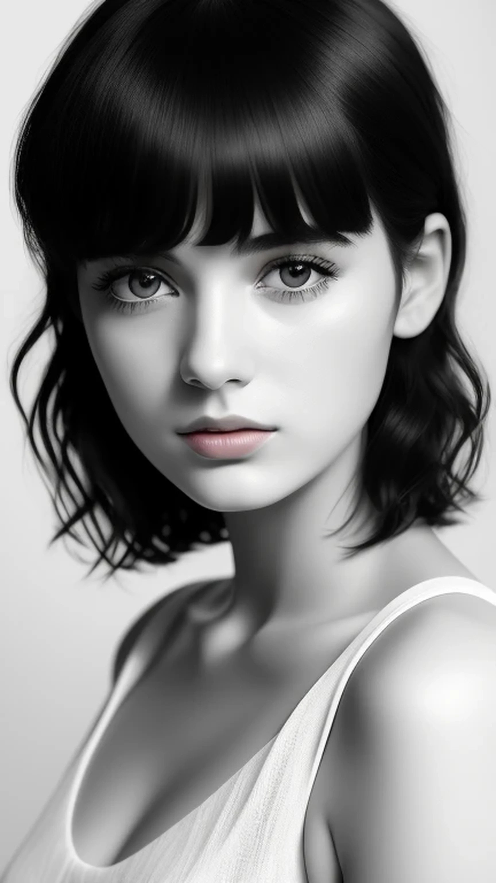 Young shy French movie actress' portrait from the sixties, looking puzzled, short black hair with bangs, minimalist vintage black dress, black and white painting, clear white background