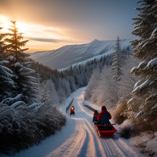 Rear view of children sledding (otherwise known as a toboggan or sledge) down snowy hillside background ((3d)), ((ultra-realistic)), ((action poses)), ((detailed background)), ((detailed bodies)), ((detailed faces)), ((detailed hands)), ((surrealistic)), ((highest resolution)), ((highest quality)), ((clothed)), ((zoom-in: 1.00))