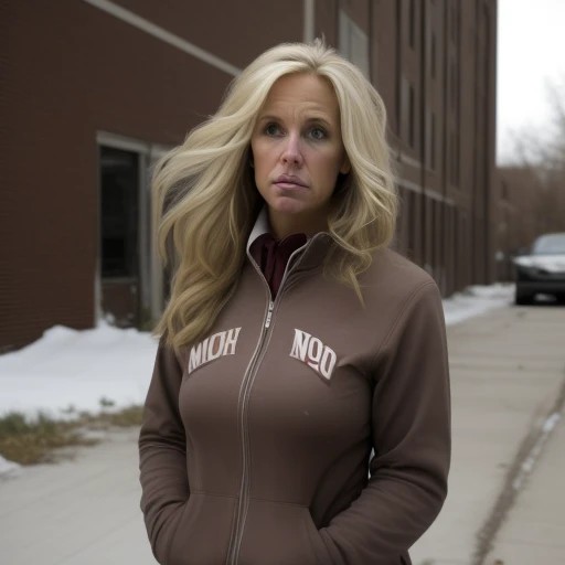 pretty blonde Minnesota gophers coaches wife looking sad in run down part of Detroit