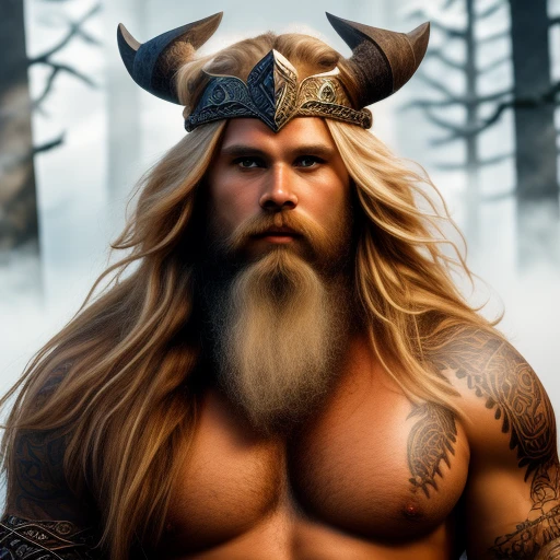 A scarred Viking berserker with a large bearded axe, long blond hair and blond beard, covered in Viking tattoos, wearing a bear headdress
