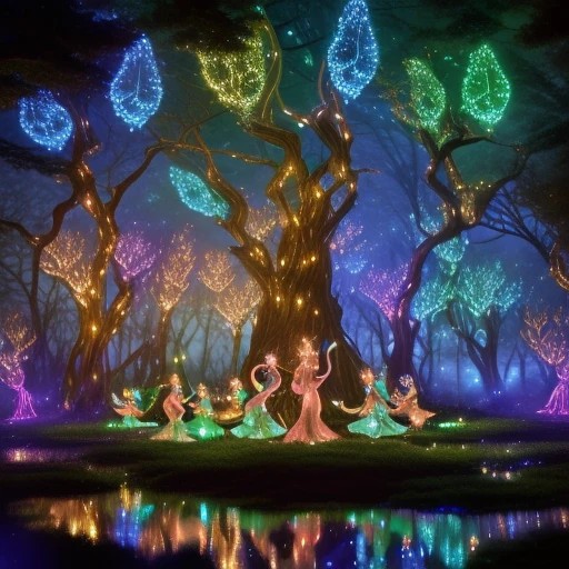 A captivating group of glowing sprites gracefully float through a magical forest, surrounded by twinkling lights and vibrant colors, creating a mesmerizing atmosphere. The ethereal sprites illuminate the scene with their delicate glow, adding an enchanting charm to the stunning landscape.